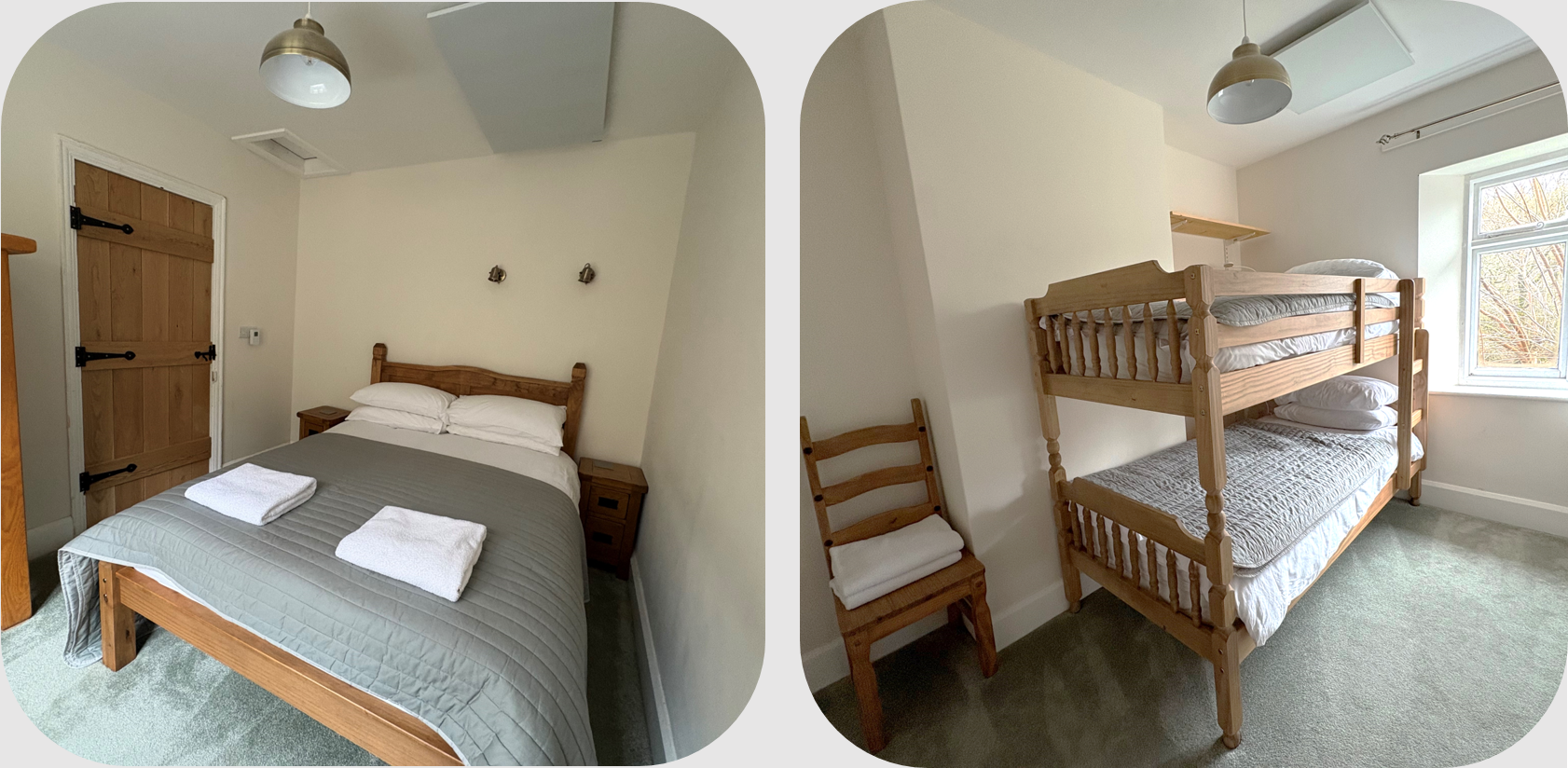 A wooden staircase leads up to two double bedrooms, a third bedroom with a bunk bed and a shower room.